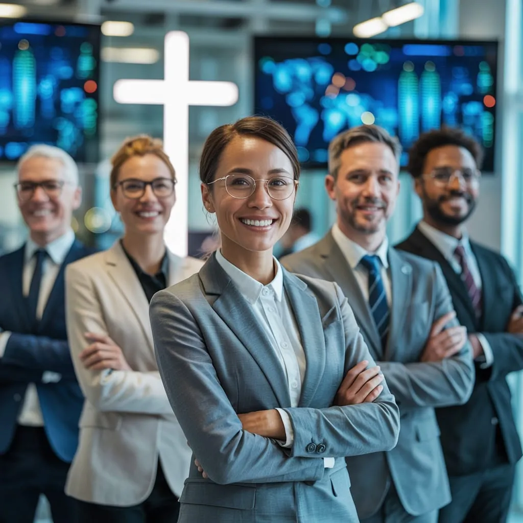 IMAGE PROMPT: Professional headshot style image of diverse business people in modern office setting with subtle cross reflection in glass window, AI visualization on screens in background, conveying competence and faith integration.