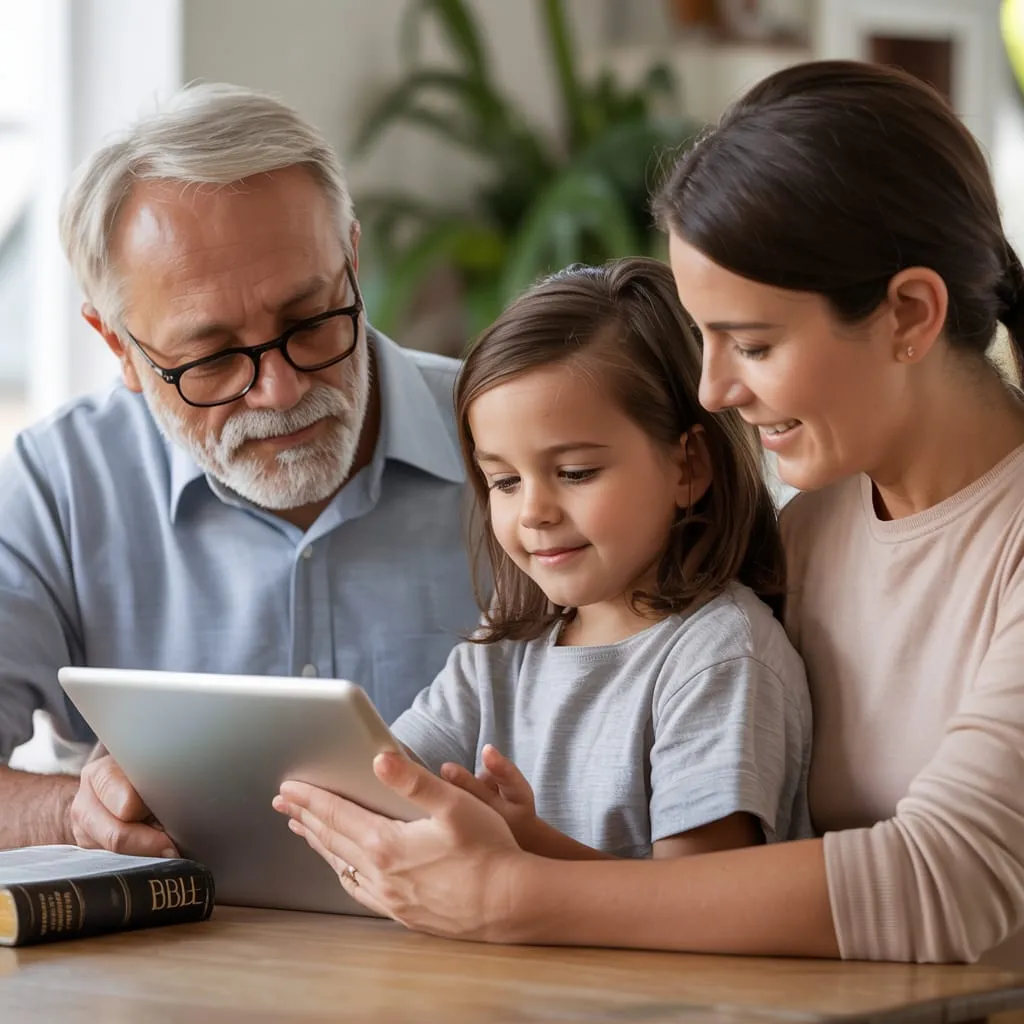 IMAGE PROMPT: Warm, family-friendly image showing three generations (grandparent, parent, child) gathered around a tablet, with a Bible also visible on the table, soft natural lighting suggesting home environment, expressing unity and peaceful learning together.