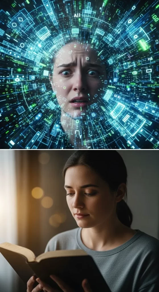 IMAGE PROMPT: Vertical format showing split screen – top half shows stressed person surrounded by swirling AI/tech imagery, bottom half shows same person peaceful with Bible and soft light, dramatic but hopeful transformation visual.