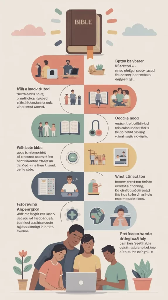 IMAGE PROMPT: Tall Pinterest-optimized infographic with soft pastel colors, featuring Bible at top, flowing down to AI icons, interconnected with scripture references, ending with peaceful family using technology together, clean and pinnable design.