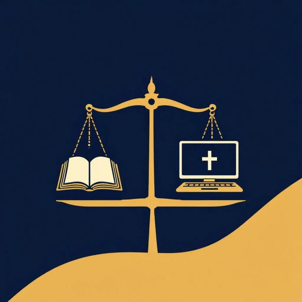IMAGE PROMPT: Simple, clean graphic with Bible and computer icon balanced on a scale, soft blue and gold colors, minimalist design with cross subtly incorporated.